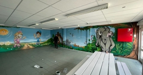 Het Beverwijkse graffiticollectief Spatzuiver is maandag begonnen met het werk aan een windscherm voor Tata Steel. Eind juli moet de wand, van in totaal 18.000 vierkante meter, af zijn. Twee jaar voorbereiding is daaraan voorafgegaan. ,,Het is functionele wand die wij met een kunstwerk mooi mogen maken.’’